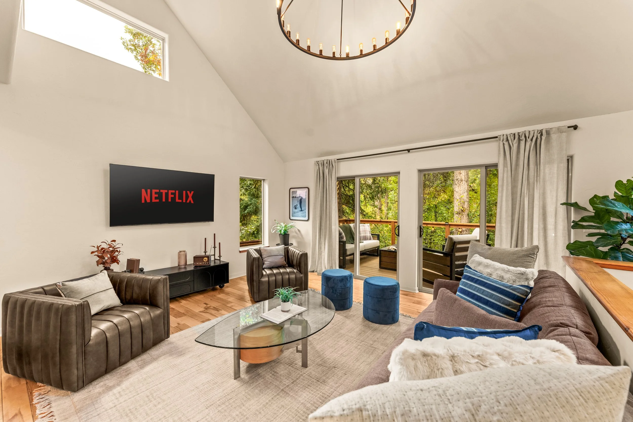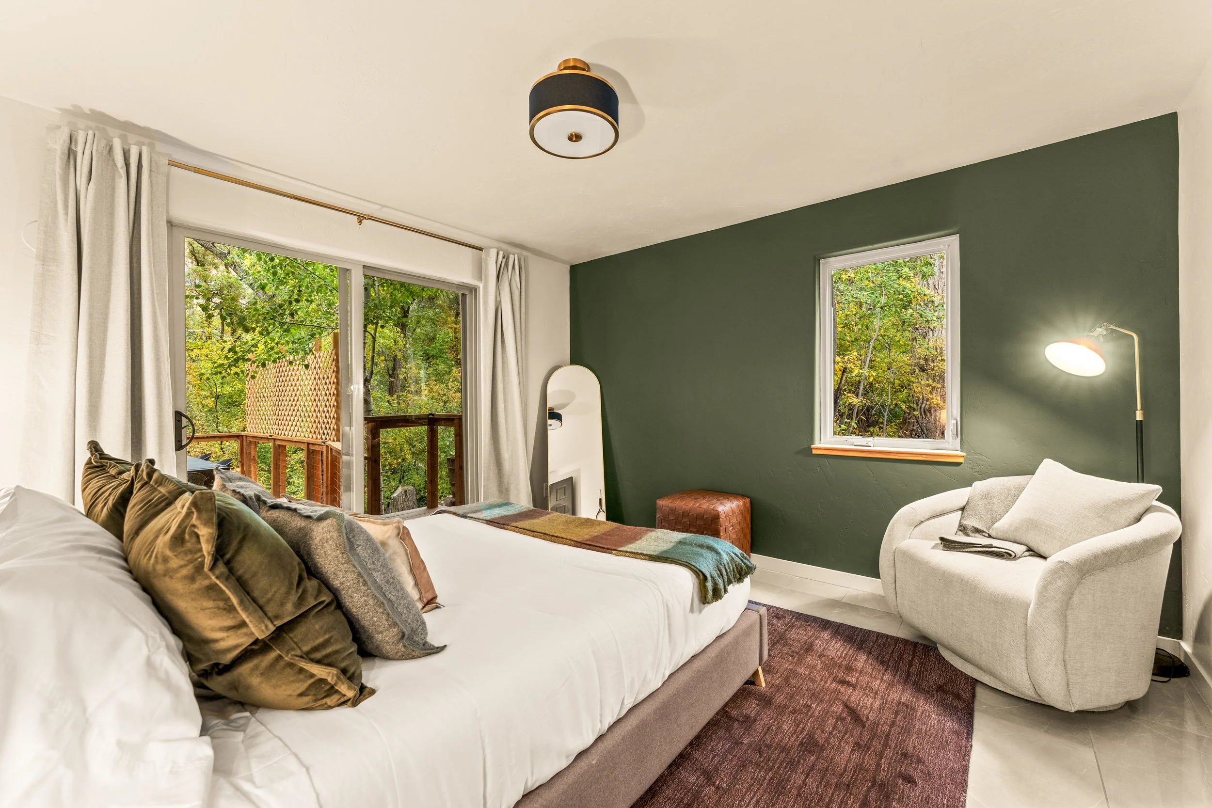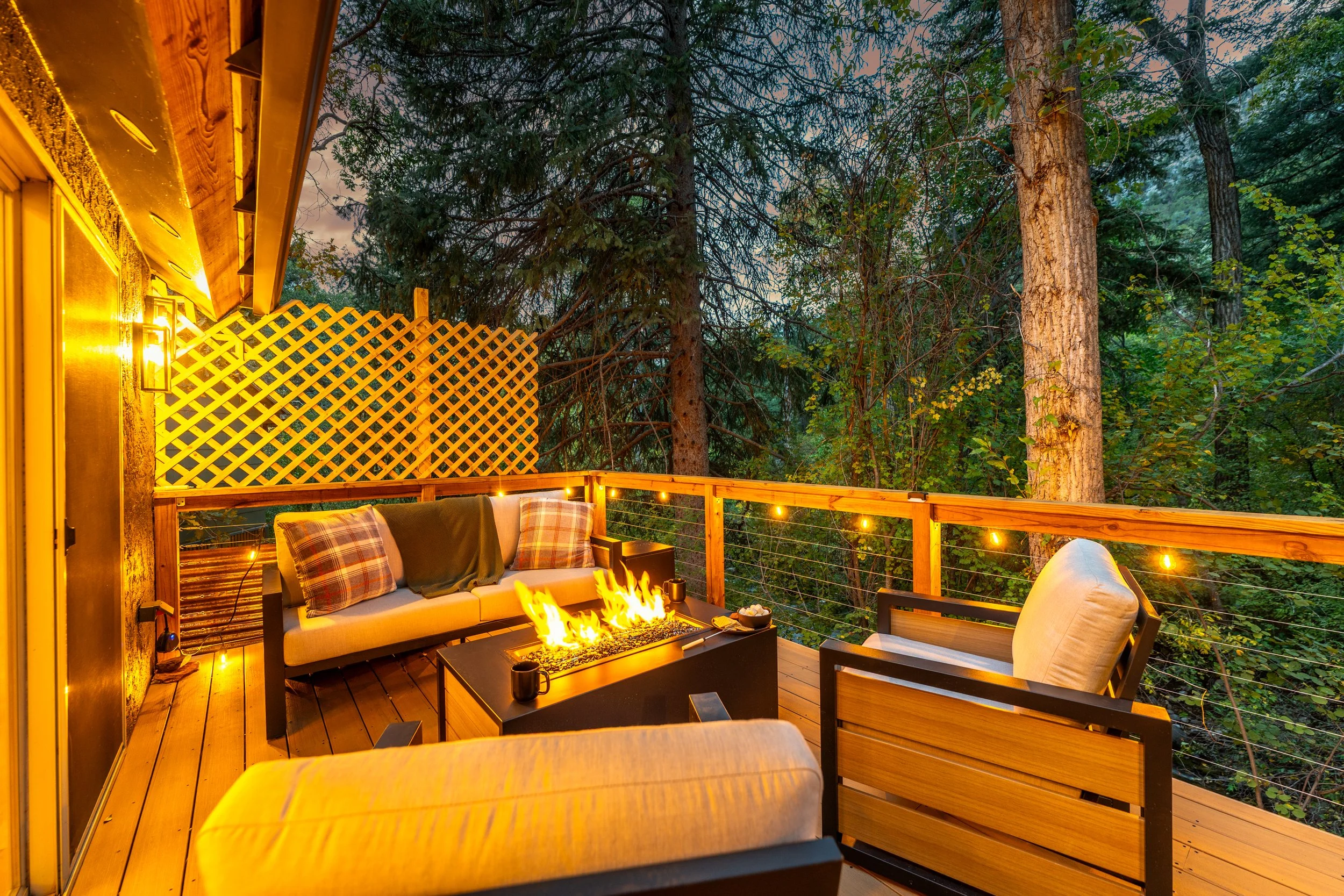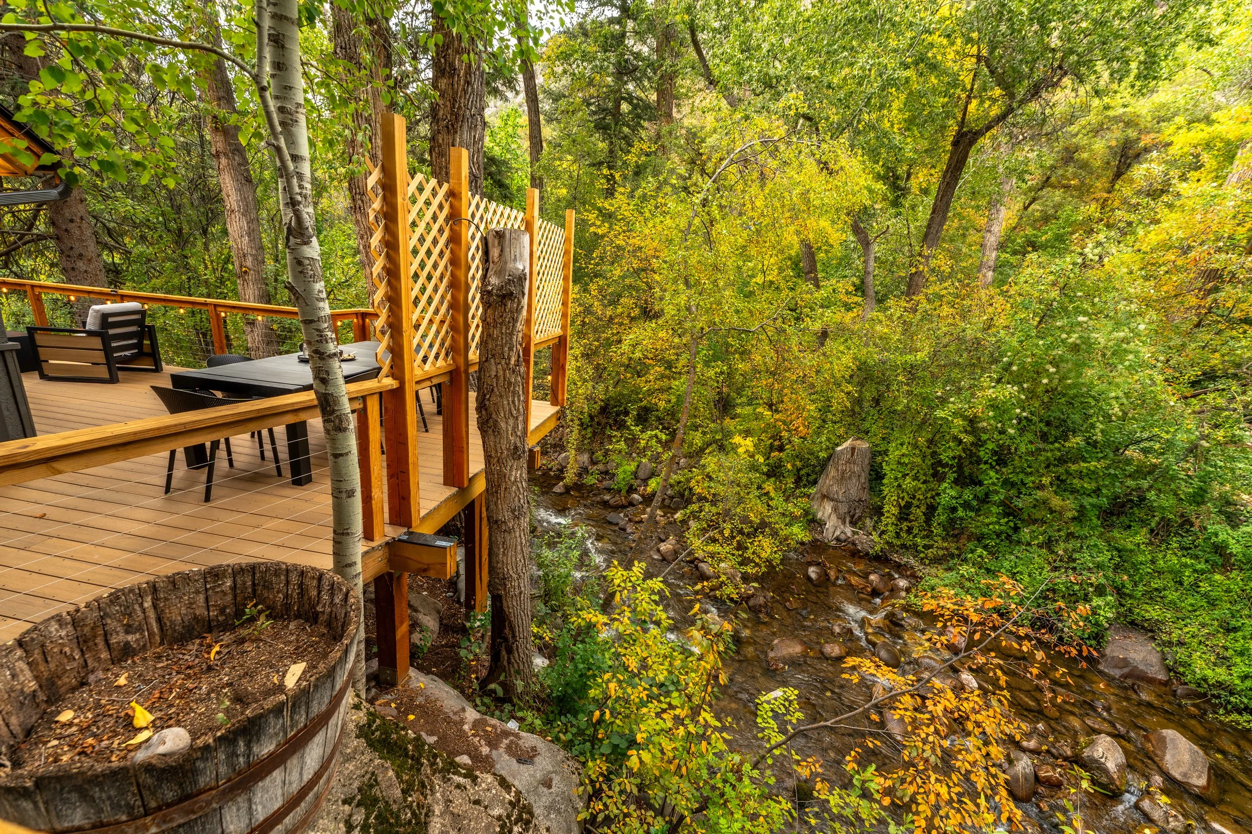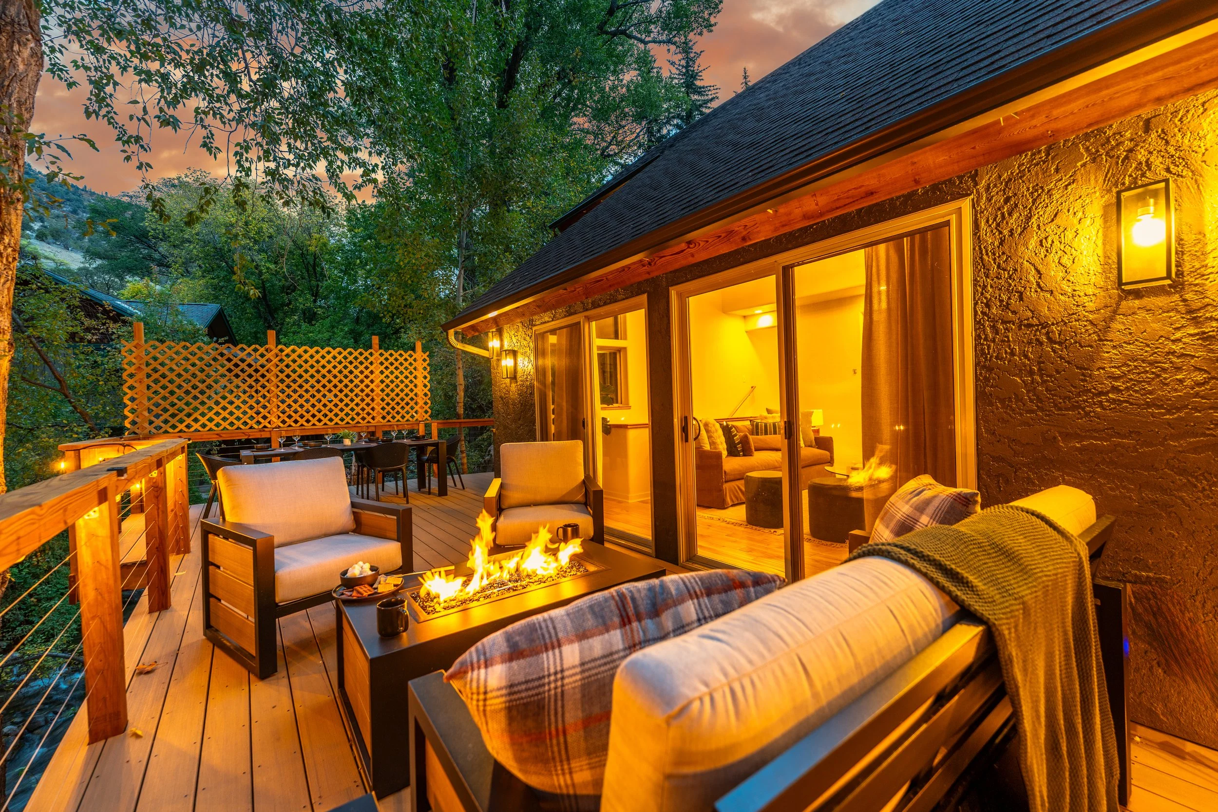 Each bedroom features Tempur-Pedic beds, expansive deck views over the creek, while the outdoor spaces invite slow mornings, starlit evenings, and moments of true stillness. Whether you're here to bike the canyon trails, soak in the nearby hot springs, or simply relax fireside, this is a place where nature and comfort live side by side.